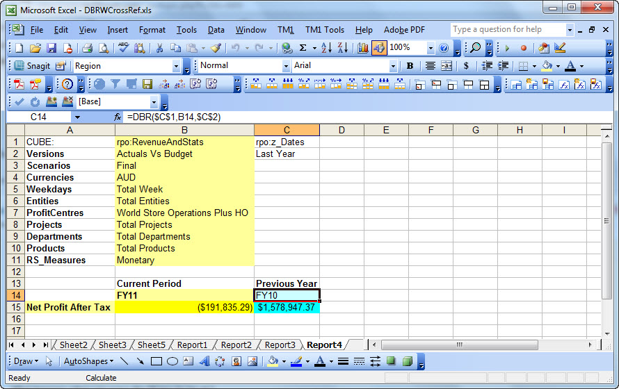 Let me see whether I can explain this graphically. You start out with a report based on a standard slice. The DBRW is in the bright yellow cell. The arguments are in the pale yellow cells. All of them are SubNm functions except for the account in cell A15, which is hard coded. The Weeks value is in B14, and is also a SubNm. This works fine. Now suppose that we want to put a second column in which shows the values for the corresponding period in the previous year. In this model there's a cube that can do that called z_Dates. It has two dimensions; one shows all of the dates, the other the lookup values. We can then create a DBRW formula to look up the "Last Year" value for whatever period the user selects. Again the formula is in bright yellow cell C14), with the arguments in light yellow. So far, so good. However let's now add a DBRW which uses that prior year value. It goes into cell C15, and points to the same cells as the original one except for the Weeks dimension, which uses the calculated prior year value in C14 instead of the SubNm formula in B14.bast wrote:Where i have to change DBRW formula to DBR ? because in each cells of my worksheet i have DBRW formula ?Paul Segal wrote: So it sounds like you are referencing a DBRW from your DBRW formulas, as Alan said. Again, as Alan pointed out, the more efficient way of correcting this is to make the formula you are referencing from the other DBRW formulas a DBR. This will mean the rest can be DBRW formulas and should be faster to refresh.